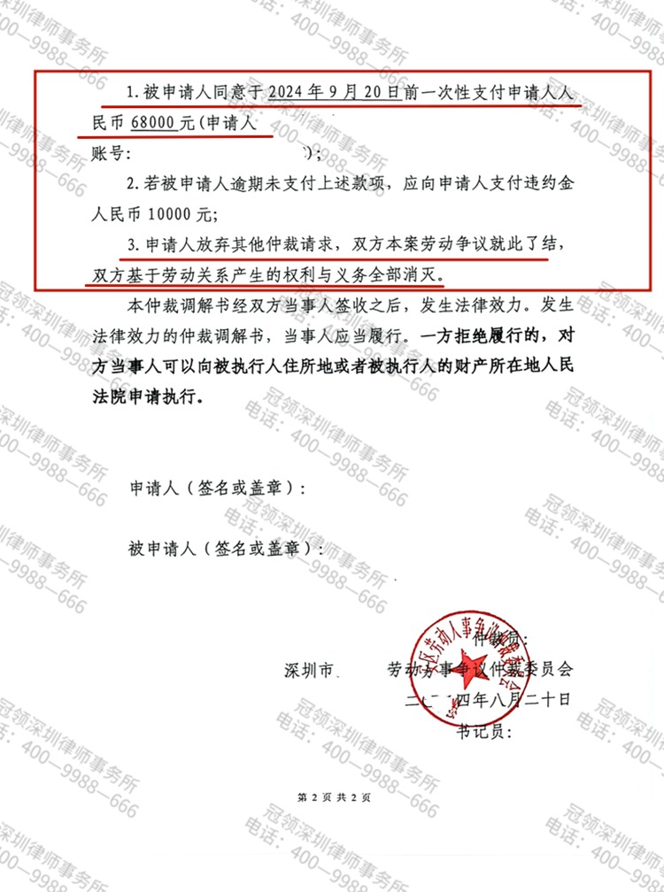 经仲裁委员会调解,刘某与建筑企业达成协议:企业于2024年9月20日前一次性支付刘某6.8万元,较原诉求减少近9.7万元;若企业逾期未支付,需承担1万元违约金;刘某放弃其他仲裁请求,双方劳动关系争议全部了结。本案中,冠领律师通过精准把握法律适用、合理拆解诉求金额,既保障了劳动者的合法工伤权益,又为企业大幅降低争议成本,实现了法律效果与商业价值的平衡。